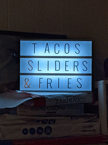 Sliders, tacos, hot dogs and fresh cut fries. Fresh squeezed lemonade, iced tea, and Horchata.